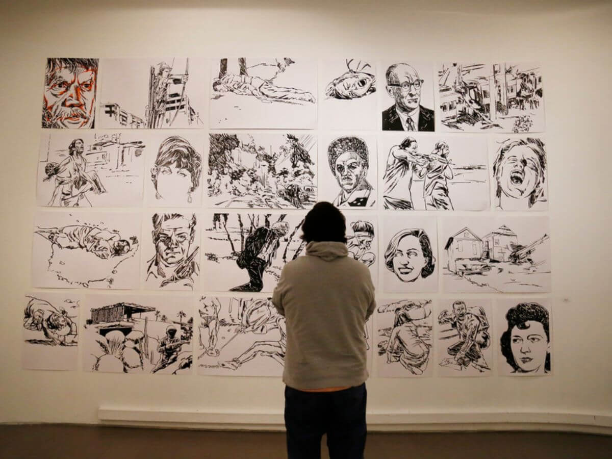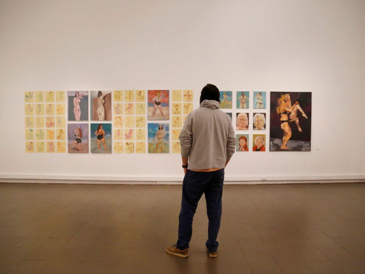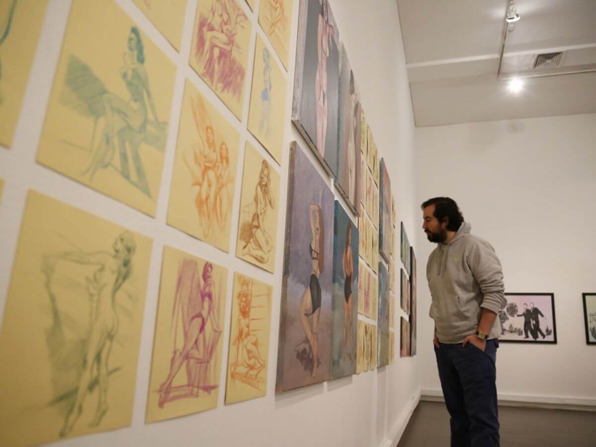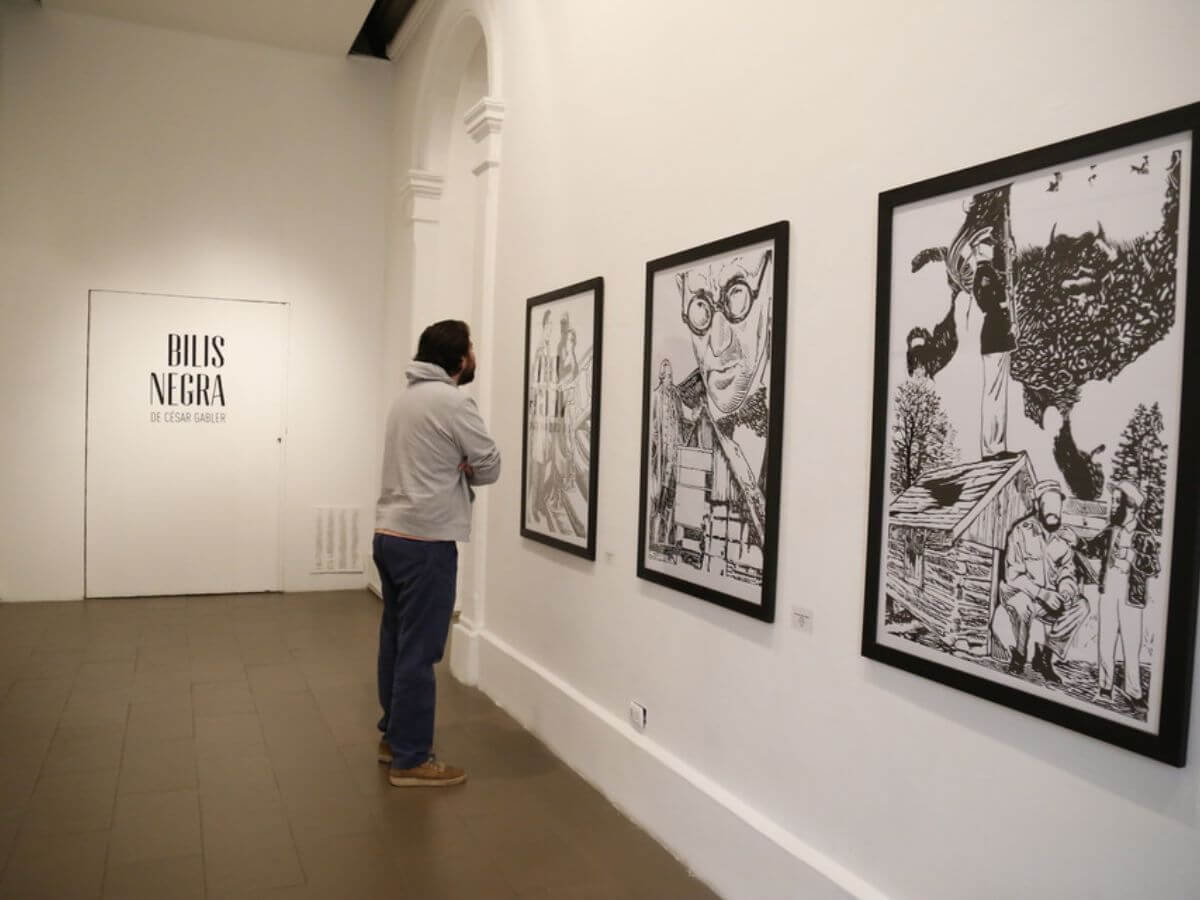 La exposición reúne diversas series que exploran el relato visual desde perspectivas narrativas, formales y conceptuales. Aunque originalmente centrada en el color negro, la muestra evolucionó hacia un eje más amplio: la narración como forma de pensamiento visual. Así, obras como Los Héroes Casi Nunca Llegan a Casa o Tradición, Familia y Propiedad abordan temas como el poder, la pareja y la propiedad a través de dibujos de líneas, planos y color que esquivan lo puramente descriptivo. En Novela Sin Fin, Gabler reflexiona sobre la historia y la biología como capas de un relato que se despliega en el tiempo. Inspirado por Peter Adolphsen, el artista propone una lectura existencialista del eterno retorno, donde la violencia —real o simbólica— emerge como constante. La serie El Hombre Que Quería Entender a las Mujeres adopta un enfoque heteronímico, presentando a un personaje ficticio que, recluido en su taller, estudia lo femenino desde una mirada obsesiva y fragmentada. Finalmente, La Figura y el Lugar recurre a la técnica del collage en acuarela para construir escenas a partir de fragmentos intercambiables, explorando nuevas formas de articulación visual y dejando entrever una reflexión sobre el tiempo, la identidad y la maleabilidad de la vida.