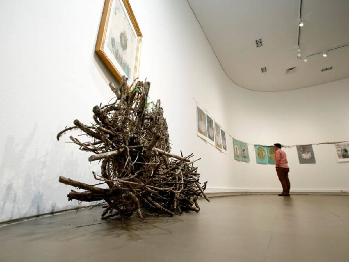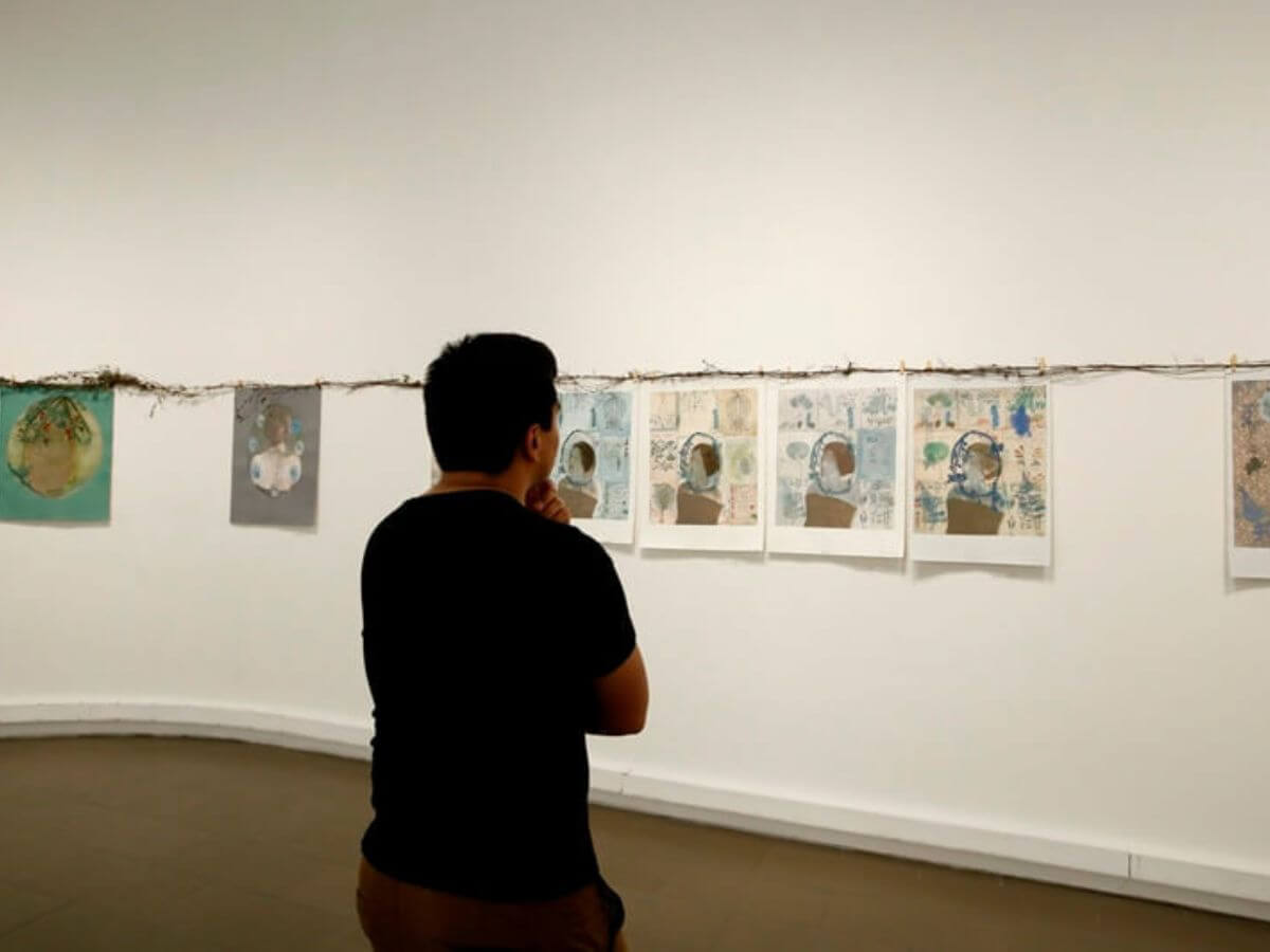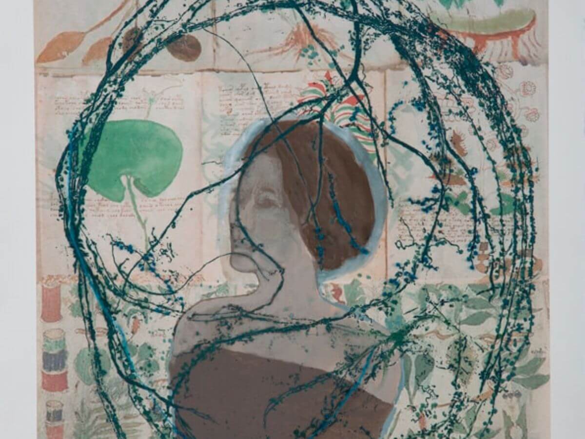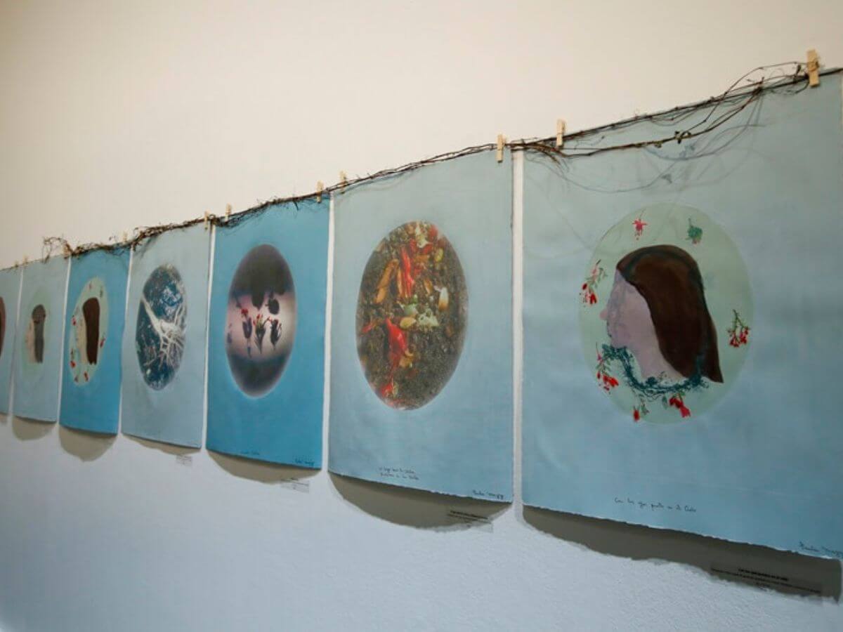 La exposición presenta un conjunto de obras que combinan fotografía digital intervenida con grabado en metal, bordado y pintura al temple. La artista, influenciada por su reciente residencia en el sur de Chile, aborda el autorretrato entrelazado con la naturaleza local. Su trabajo es una exploración profunda del autoconocimiento, donde las manos se transforman en ramas que se funden con su imagen, simbolizando una conexión orgánica y ancestral. Mazry utiliza tonos opacos y pigmentos naturales mezclados con yema de huevo, generando una atmósfera melancólica y lírica. Sus retratos oníricos revelan vulnerabilidades humanas, iluminando las sombras sin oscurecerlas, y resaltan la belleza efímera de lo vivo, representada en coronas de ramas y flores. Su obra es una poesía visual llena de metáforas y simbolismos, que invita al espectador a una reflexión íntima y silenciosa. Así, ofrece un monólogo visual que desvela la relación entre cuerpo, alma y naturaleza, proponiendo una mirada honesta y profunda hacia nosotros mismos.
